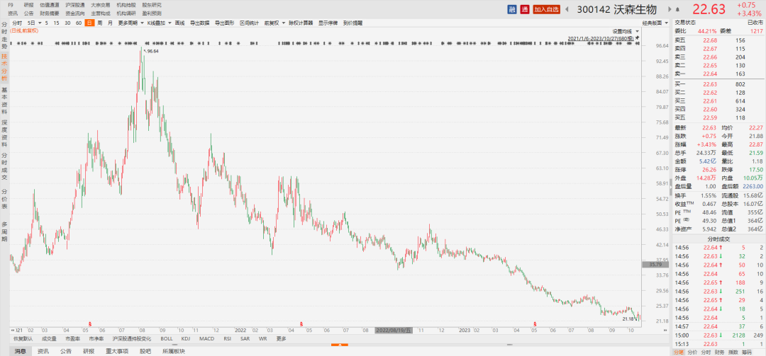 从股价表现看,自2021年8月以来,沃森生物在下跌超过70%,市值从最高近1500亿元下跌至不足400亿元。