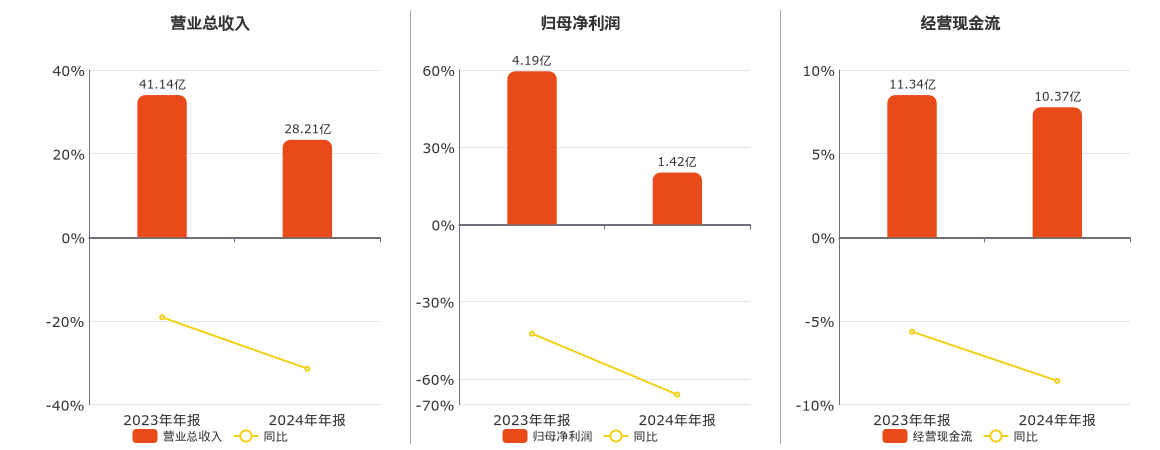 公司营业总收入为28.21亿元,较去年同报告期营业总收入减少12.92亿元,同比较去年同期下降31.41%。归母净利润为1.42亿元,较去年同报告期归母净利润减少2.77亿元,同比较去年同期下降66.10%。经营活动现金净流入为10.37亿元,较去年同报告期经营活动现金净流入减少9724.43万元,同比较去年同期下降8.58%。