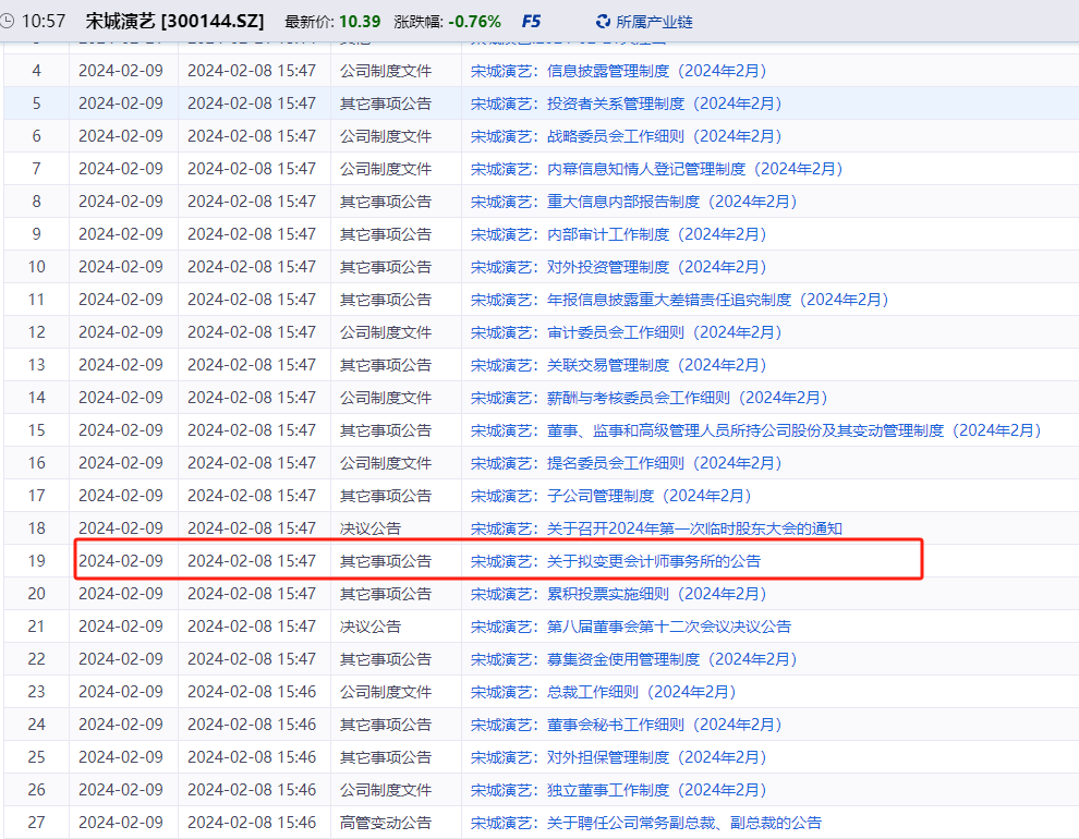 此前的2月8日也即春节前最后一个交易日盘后,宋城演艺连发20余份公告,除了多份制度性文件外,就包括了上述关注函提到的《关于拟变更会计师事务所的公告》(以下简称“换审公告”)。