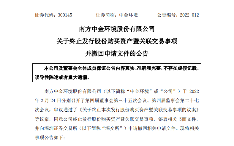 2月24日,中金环境(300145.SZ)发布公告称,同意终止发行股份购买资产暨关联交易事项,签署相关书面文件,并向深交所申请撤回相关申请文件。