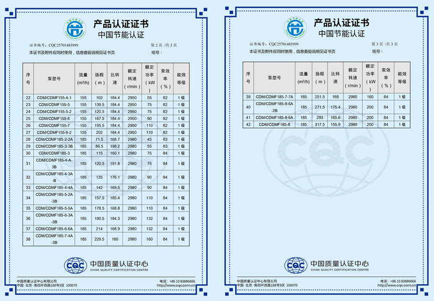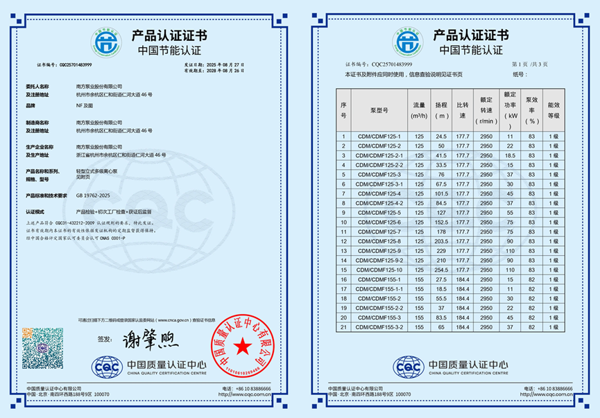 作为该国家标准研制的主要参与单位之一,南方泵业积极参与了前期技术验证与实验工作,为标准的科学性和实用性提供了重要支持。CDM(F)系列获得首张1级能效证书,不仅印证了该产品系列在高效节能方面的卓越性能,也体现出南方泵业在推进泵系统能效提升方面的技术积累和行业引领作用。