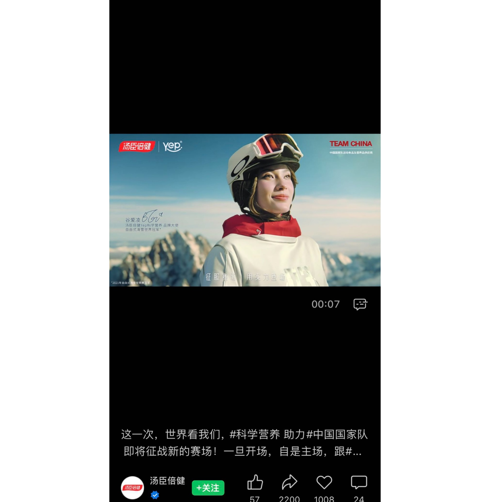 汤臣倍健Yep科学营养品牌大使谷爱凌(汤臣倍健视频号截图)