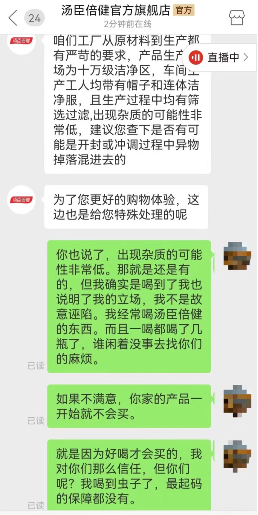 拍下照片后,她去找汤臣倍健的客服沟通,对方坚持说卫生没问题。