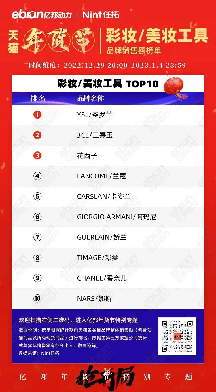 彩妆方面,排名前两位的是YSL圣罗兰和3CE三熹玉,国产品牌花西子紧随其后进入前三。法国兰蔻位列第四。此外,卡姿兰、彩棠两家国产品牌也榜上有名。