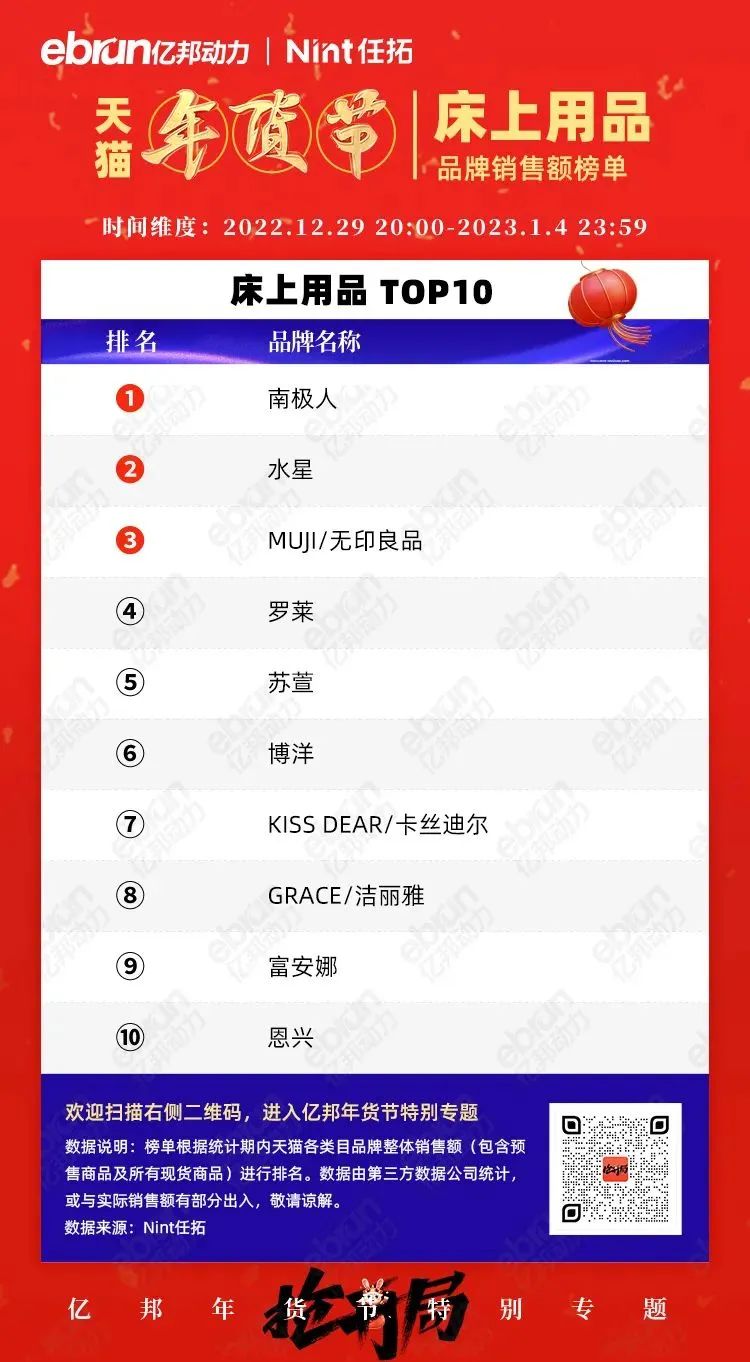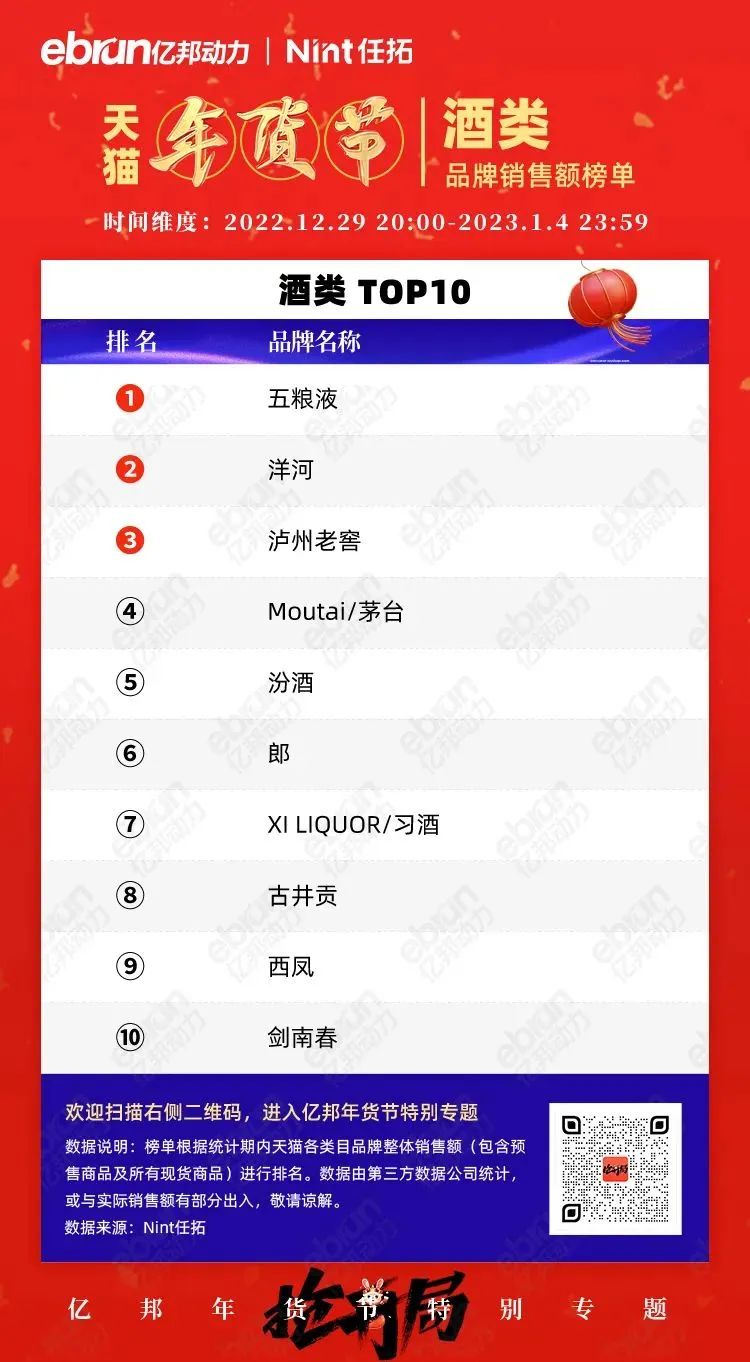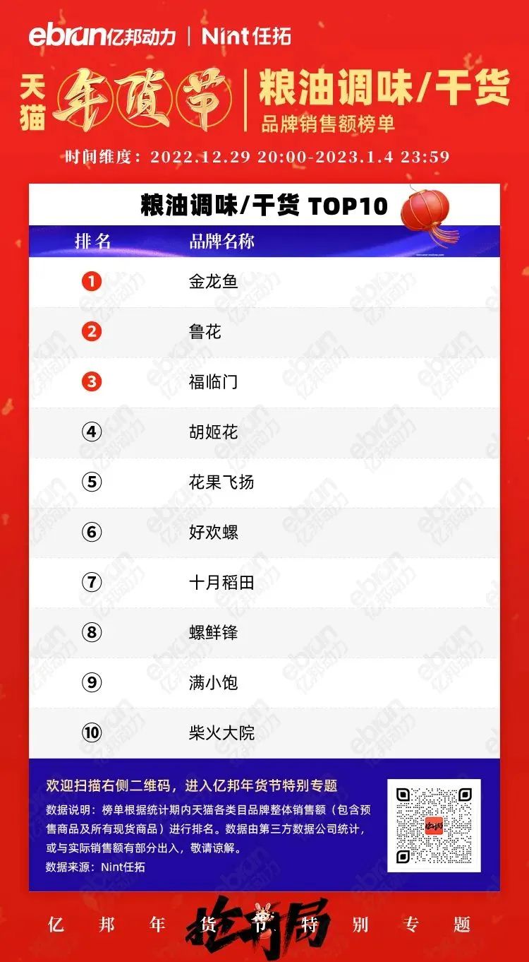 (快消品讯)近日,亿邦动力联合数字零售数据服务商Nint,整理了天猫年货节销售额榜单,榜单根据统计期内(2022年12月29日20:00至2023年1月4日24:00)天猫各品类品牌整体销售额进行排名。
