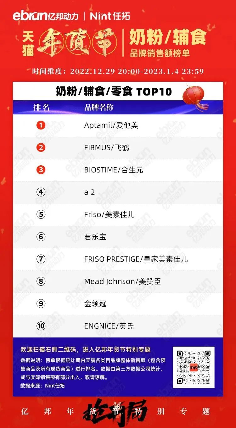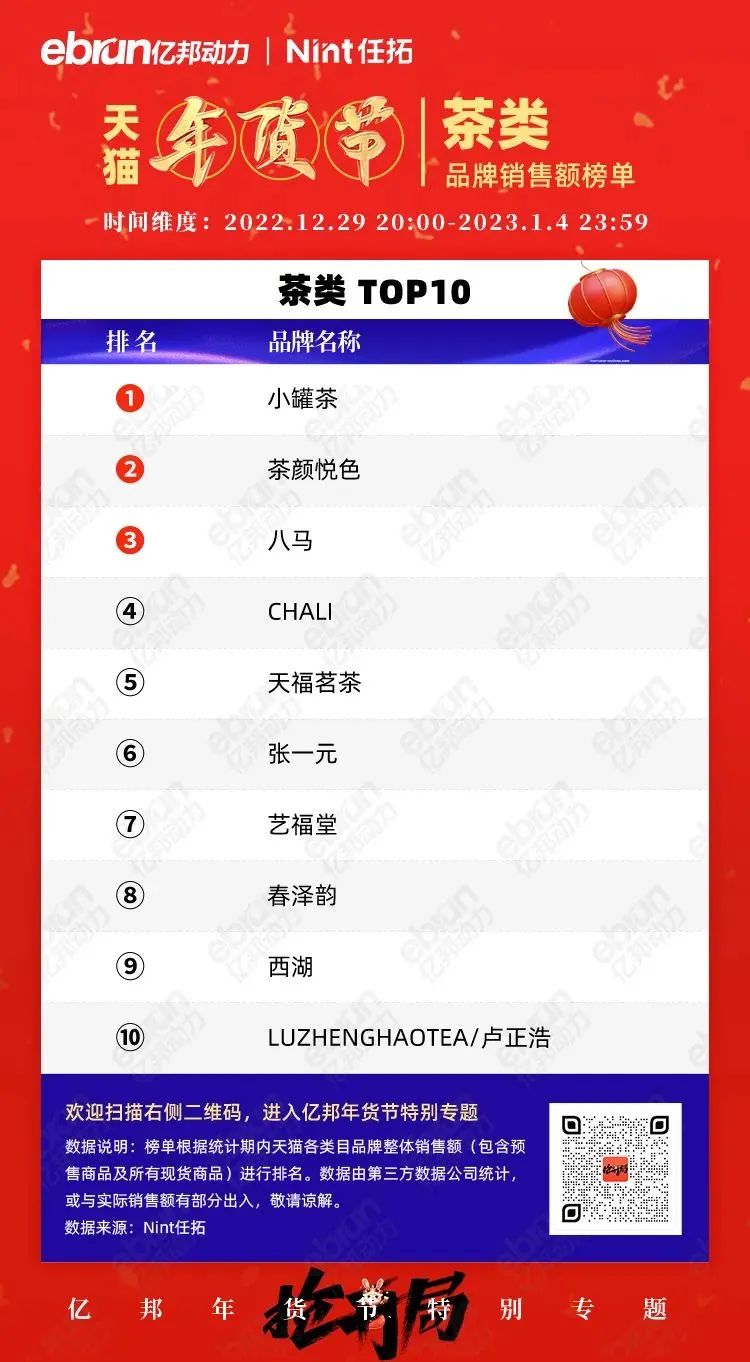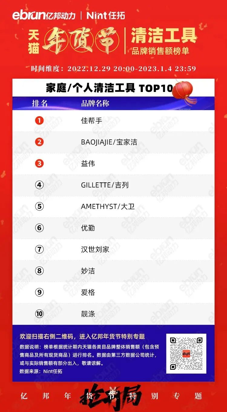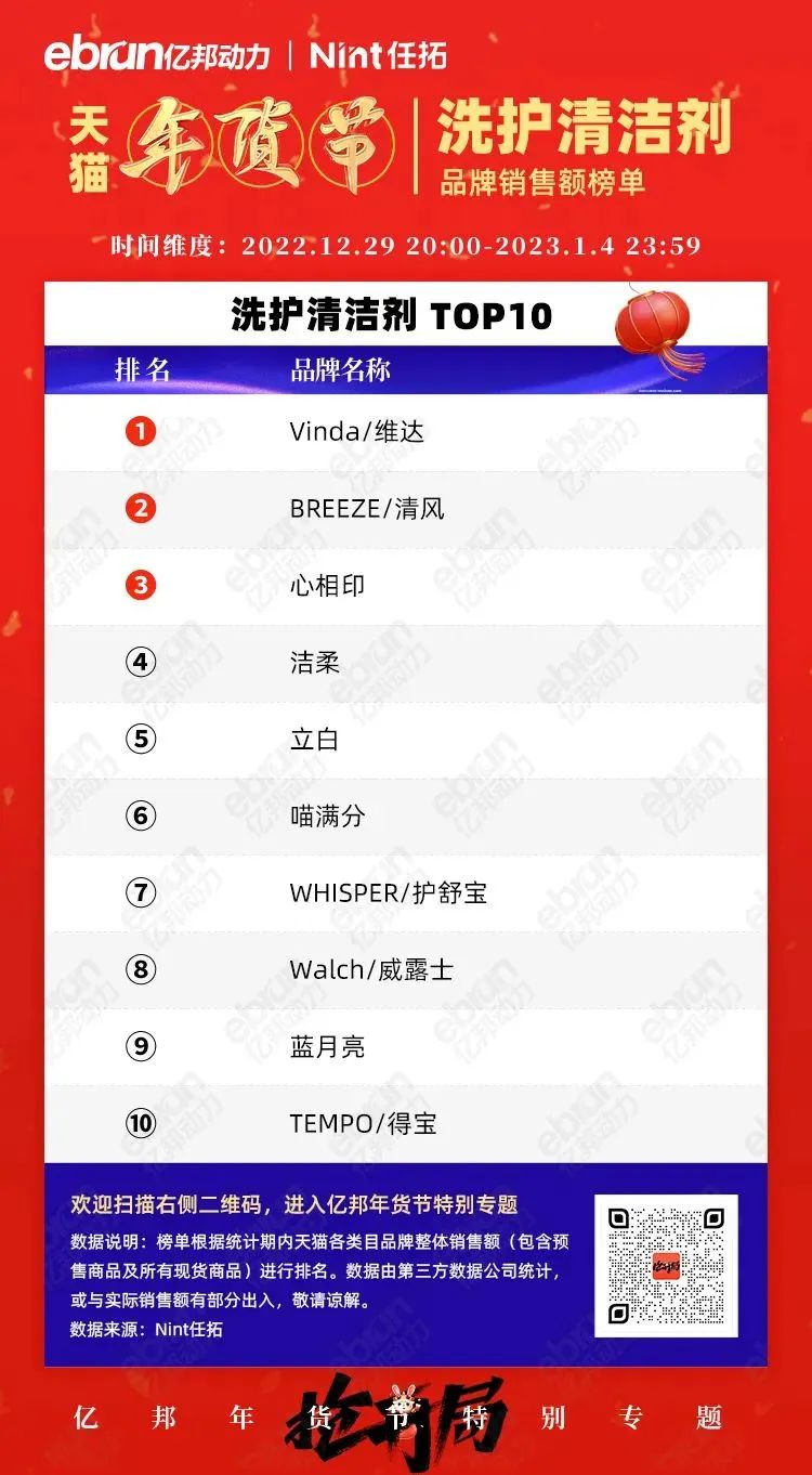(快消品讯)近日,亿邦动力联合数字零售数据服务商Nint,整理了天猫年货节销售额榜单,榜单根据统计期内(2022年12月29日20:00至2023年1月4日24:00)天猫各品类品牌整体销售额进行排名。