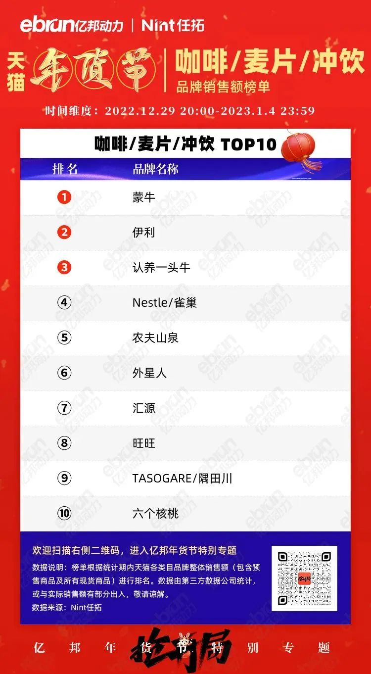 国产乳业品牌蒙牛、伊利和认养一头牛霸榜前三,上榜的咖啡品牌分别是雀巢和隅田川,位居第四位和第九位。三个常见“年货”品牌汇源、旺旺、六个核桃登上榜单。值得注意的是,外星人电解质水登上该榜单第六。