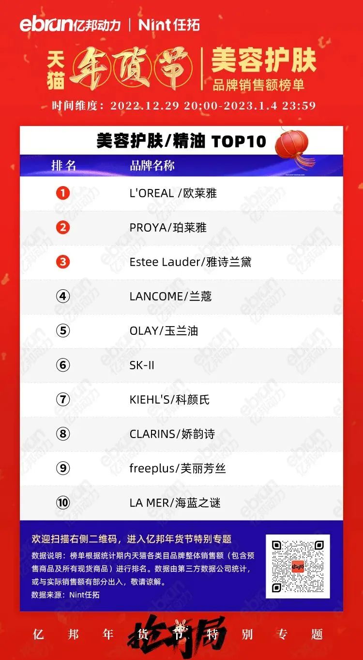 护肤美妆产品永远是年货送礼和犒赏自己的首选之一。美容护肤类目中,欧莱雅稳居第一,国货美妆上市公司珀莱雅位列第二,国际品牌雅诗兰黛、兰蔻、玉兰油依次上榜。