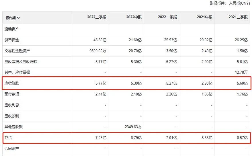 尴尬在于,截至2022年三季度末,其境内线上自营渠道收入同比增速仅3.95%,境内线下渠道收入则减少3.9%,整体营收增速也不过2.31%。且应收账款高达5.77亿元,同比增长2.94%;存货金额7.23亿元,增长9.97%。