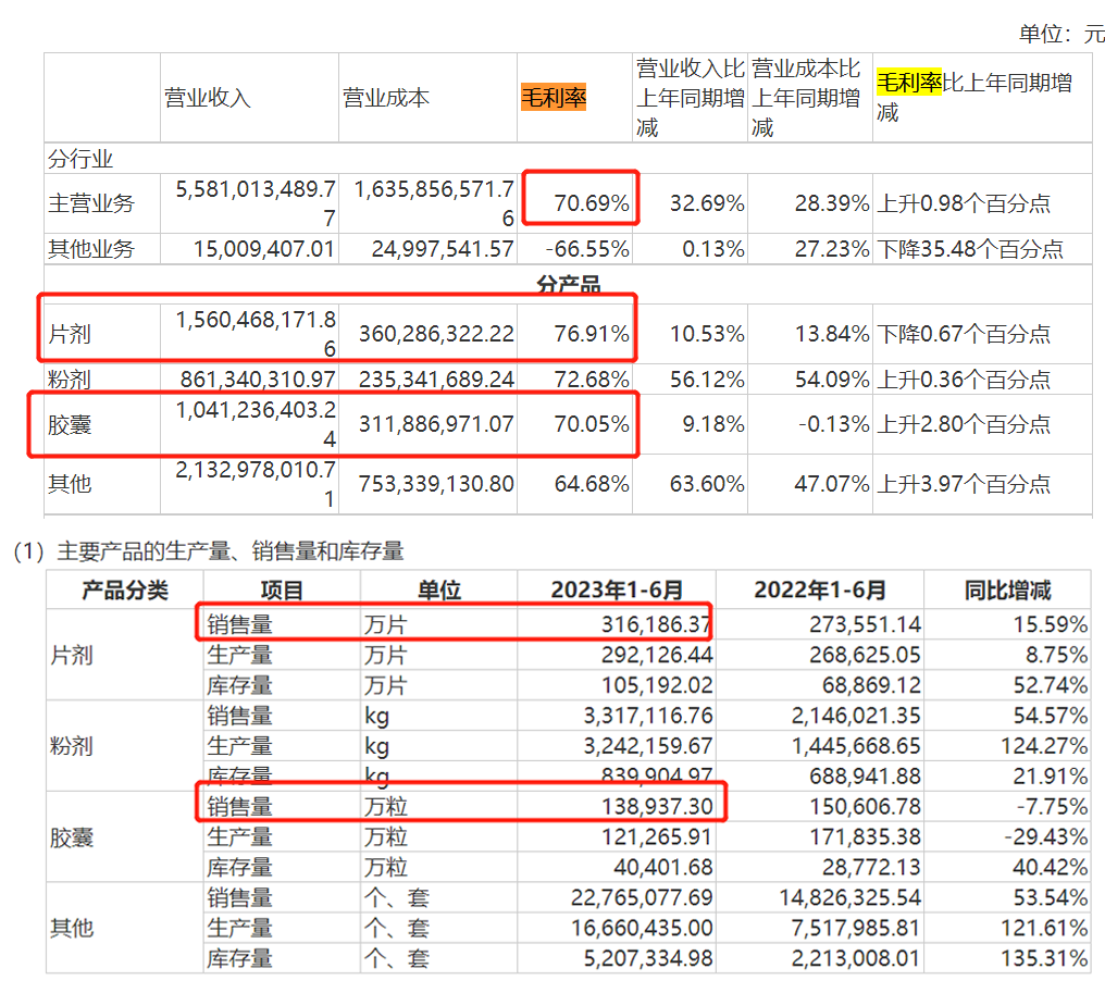 其他产品也不例外。在胶囊中,2023年上半年营业成本3.12亿元,销售量13.89亿粒,平均每粒成本约合0.22元。