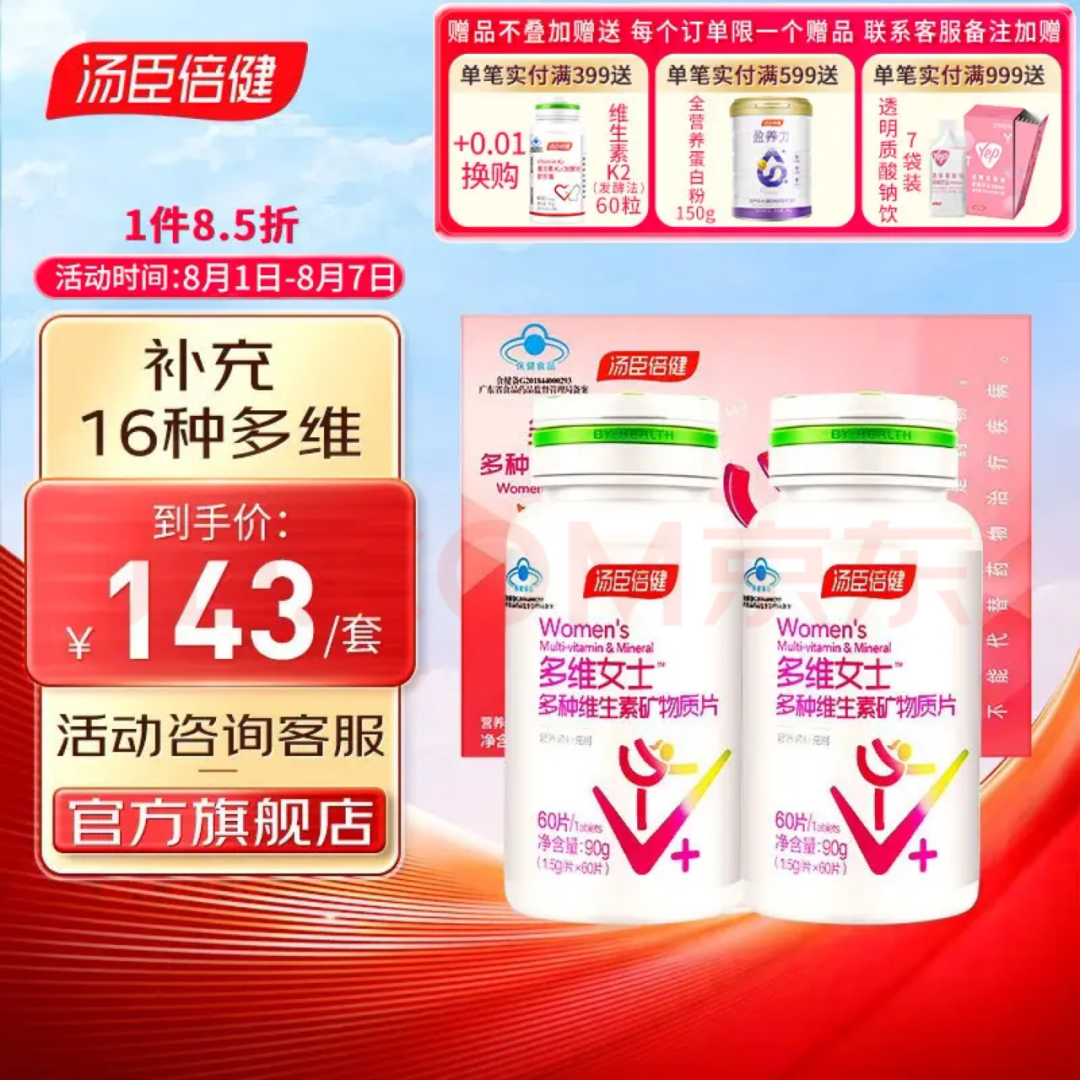 以片剂为例,8月8日,「界面新闻·子弹财经」在汤臣倍健某线上平台的旗舰店随机查询了一款多维女士多种维生素矿物质片,两瓶(每瓶60片)到手价143元,合计约1.19元/片。