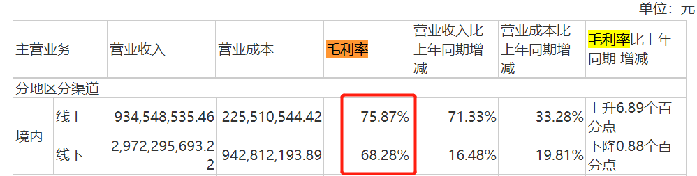 不过,和线上渠道相比,线下渠道的毛利率偏低。