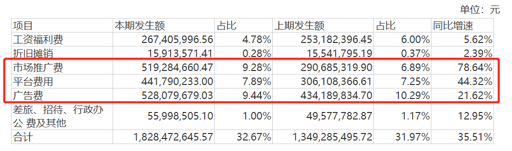 半年报显示,报告期内,企业的销售费用达到18.28亿元。其中,市场推广费、平台费用、广告费用合计14.89亿元,直逼企业上半年的归母净利润15.45亿元。
