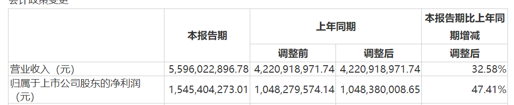 报告期内,企业实现营业收入55.96亿元,同比增长32.58%;归属于上市公司股东的净利润15.45亿元,同比增长47.41%。