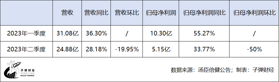 财报显示,汤臣倍健一季度营收同比增长36.30%,归母净利润同比增长55.27%;二季度营收同比增加28.18%,环比下滑19.95%;归母净利润同比增加33.77%,环比下滑50%。