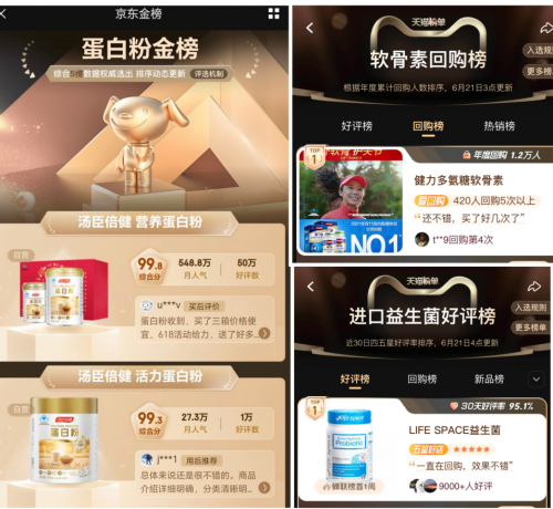 在销售额再创新高的同时,汤臣倍健也收获了一波又一波的好评,多个细分品类位居平台“热卖”“口碑”榜,如汤臣倍健蛋白粉同时占据着天猫免疫力蛋白粉品类TOP1、京东“蛋白粉金榜”TOP1。专业益生菌品牌“Life-Space”同时占据着天猫进口益生菌好评榜TOP1和京东热卖榜TOP1,整体销售额近1.6亿元,同比增长超45%。新品Yep -GAGs胶原蛋白肽新品的占据着天猫“胶原蛋白V榜”TOP1。健力多氨糖软骨素产品表现也不错,登上了天猫软骨素热卖榜、好评榜、回购榜。