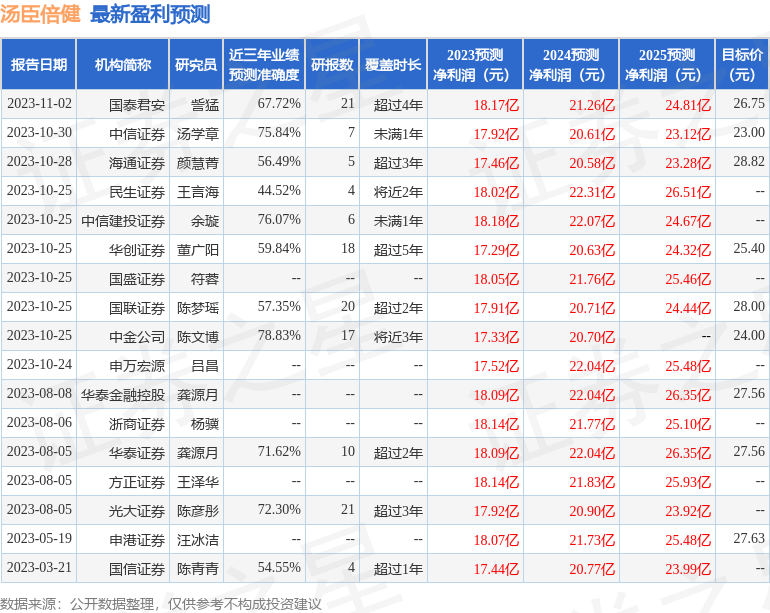 汤臣倍健2023年三季报显示,公司主营收入77.82亿元,同比上升26.34%;归母净利润19.01亿元,同比上升28.28%;扣非净利润17.98亿元,同比上升27.21%;其中2023年第三季度,公司单季度主营收入21.86亿元,同比上升12.75%;单季度归母净利润3.56亿元,同比下降17.96%;单季度扣非净利润3.44亿元,同比下降0.01%;负债率14.47%,投资收益1.1亿元,财务费用-3961.74万元,毛利率69.66%。