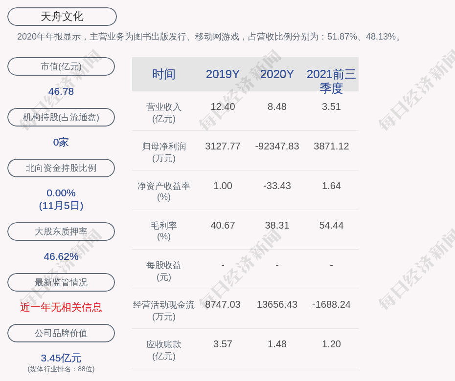 3.天舟文化在近3个交易日上涨46.95%,所属传媒板块同期上涨4.06%,创业板指同期上涨1.6%。