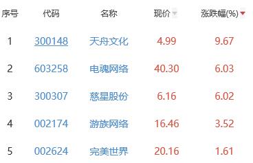 其中,天舟文化、电魂网络、慈星股份、游族网络、完美世界位列板块涨幅前五位,涨幅分别为9.67%、6.03%、6.02%、3.52%、1.61%。