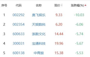 奥飞娱乐、天娱数科、浙数文化、宝通科技、中青旅位列涨幅榜后五位,涨幅分别为-10.03%、-6.06%、-5.74%、-5.67%、-5.53%。