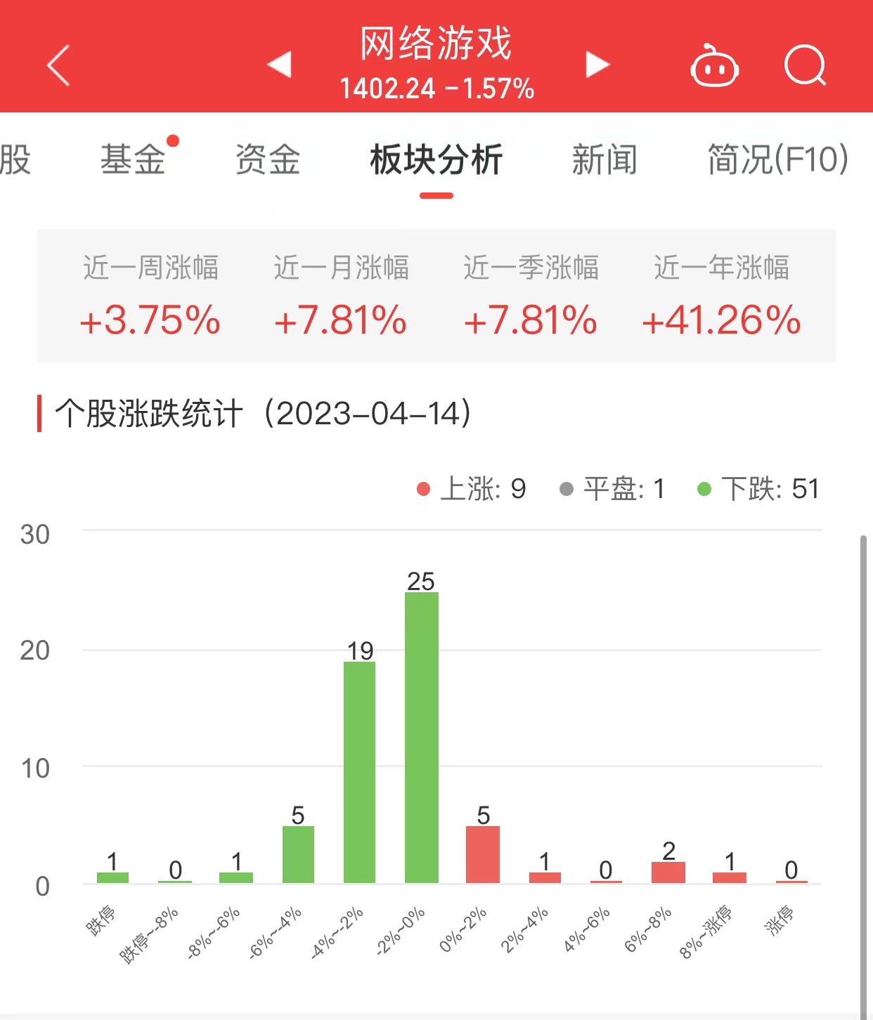 今日,网络游戏板块整体跌幅1.57%,其中9只股票上涨,1只股票平盘,51只股票下跌。