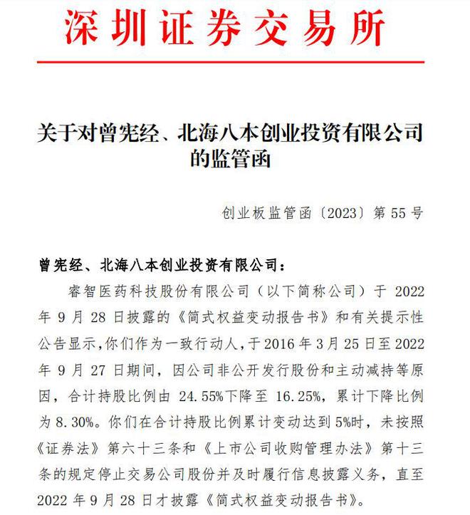监管函指出,睿智医药于2022年9月28日披露的《简式权益变动报告书》和有关提示性公告显示,曾宪经、北海八本创业投资有限公司作为一致行动人,于2016年3月25日至2022年9月27日期间,因公司非公开发行股份和主动减持等原因,合计持股比例由24.55%下降至16.25%,累计下降比例为8.30%。