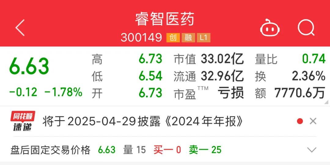 截至今日收盘,睿智医药报收6.63元,跌1.78%。
