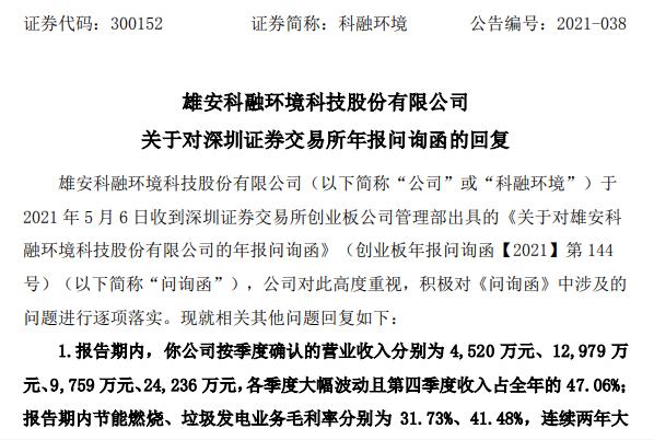 据股民110网消息,雄安科融环境科技股份有限公司(科融环境,300152)在2021年5月21日发布了《关于2020年年报问询函中有关事项的专项说明》的公告,回复了深圳证券交易所对于公司业绩等方面提出的10个问题。