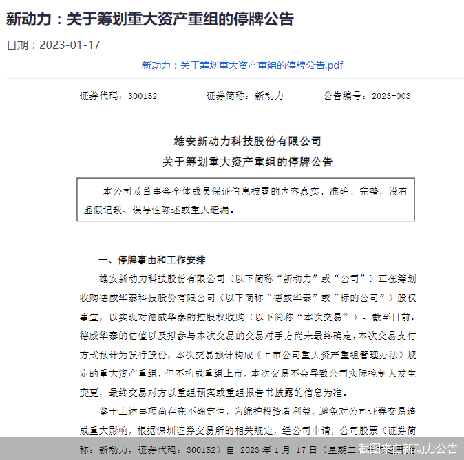 出手就是大动作。1月17日,新动力披露公告称,公司正在筹划收购德威华泰股权事宜,以实现对德威华泰的控股权收购。