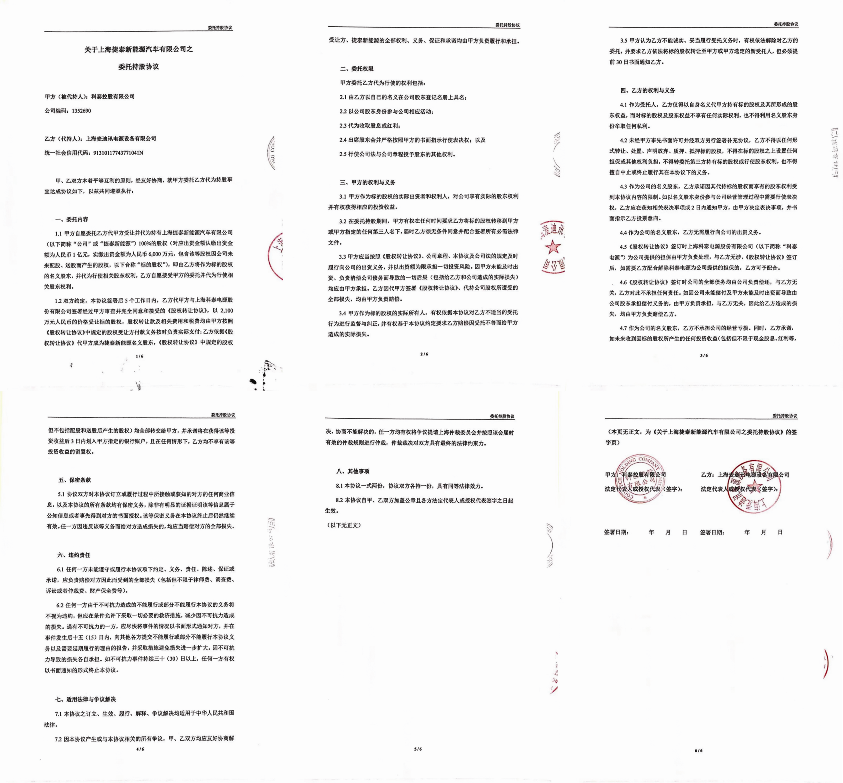 “上海捷泰表面上和科泰电源没有关系,实际却为科泰电源的控股股东科泰控股有限公司(下称“科泰控股”)及其实际控制人谢松峰拥有和控制,麦迪讯实际为科泰控股代持上海捷泰股权。”李先生向记者提供了一份《委托持股协议》(附图)。根据《委托持股协议》,乙方(“麦迪讯”)依据《股权转让协议》代甲方(“科泰控股”)成为上海捷泰名义股东,《股权转让协议》中规定的股权受让方、上海捷泰的全部权利、义务、保证和承诺均由甲方负责履行和承担。资料显示,科泰控股为科泰电源的控股股东,谢松峰持有科泰控股32.81%的股份,系科泰电源实际控制人之一。