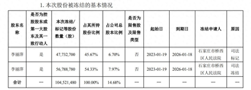 该公告显示,2023年1月19日,公司实际控制人李丽萍所持公司股份被法院申请司法冻结5678.88万股、司法标记4773.27万股,合计10452.15万股,被司法标记股份涉及的案件债权额及执行费用为49976.06万元,执行人实际需要冻结的数量为4773.27万股。