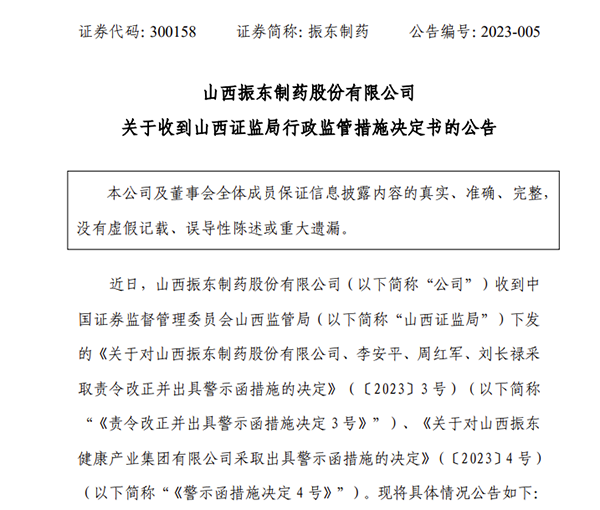 昨日晚间,山西振东制药股份有限公司(“振东制药”300158.SZ)发布公告称,近日收到中国证券监督管理委员会山西监管局(“山西证监局”)下发的《关于对山西振东制药股份有限公司、李安平、周红军、刘长禄采取责令改正并出具警示函措施的决定》(〔2023〕3号)(“《责令改正并出具警示函措施决定3号》”)、《关于对山西振东健康产业集团有限公司采取出具警示函措施的决定》(〔2023〕4号)(“《警示函措施决定4号》”)。