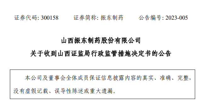 近日,山西振东制药股份有限公司收到中国证券监督管理委员会山西监管局下发的警示函措施的决定,对山西振东制药股份有限公司及李安平、周红军、刘长禄采取责令改正并出具警示函的监督管理措施,并记入证券期货市场诚信档案。