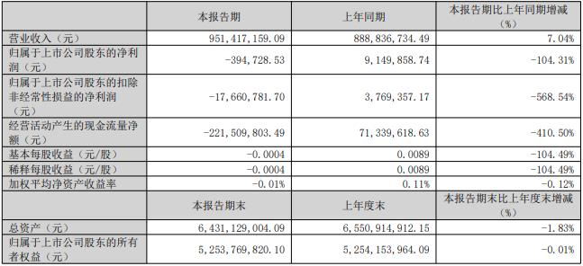 振东制药2023年一季度报告显示,2023年一季度,振东制药实现营业收入9.51亿元,同比增长7.04%;归属于上市公司股东的净利润-39.47万元,同比下滑104.31%;归属于上市公司股东的扣除非经常性损益的净利润-1766.08万元,同比下滑568.54%;经营活动产生的现金流量净额-2.22亿元,同比下滑410.50%。