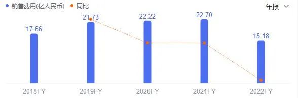 虽然这是2018年以来企业销售费首降,相较2021年降幅达33.15%,但超15亿的体量还是够扎眼。