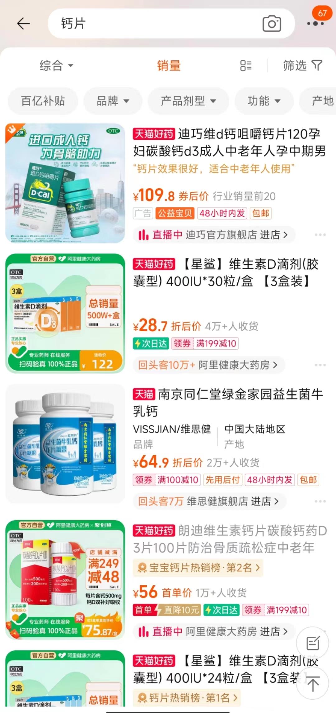 界面新闻记者在电商平台以“钙片”为关键词进行搜索,并按照销量高低进行排序。淘宝上销量前五的钙片分别为星鲨维生素D滴剂、南京同仁堂绿金家园益生菌牛乳钙、朗迪碳酸钙、星鲨维生素D滴剂(胶囊型)、星鲨维生素D3滴剂(胶囊型)月销量分别为6万+、5万+、2万=、3万+和2万+。