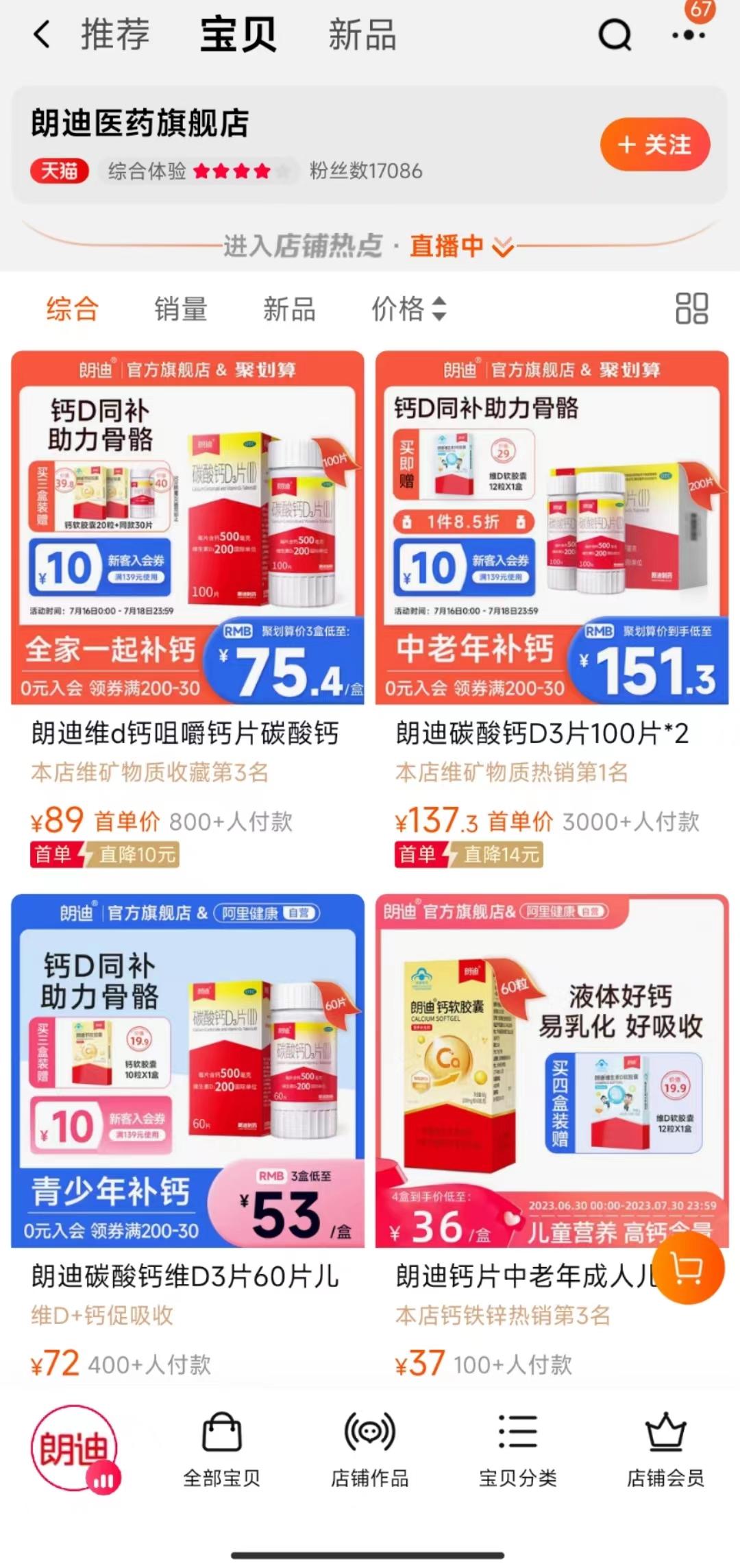 而以“朗迪钙”为关键词在电商平台上进行搜索,其价格在40-80元之间,销量最高在2万+。而在京东朗迪医药旗舰店,销量最高的钙片的销量额在3000+。