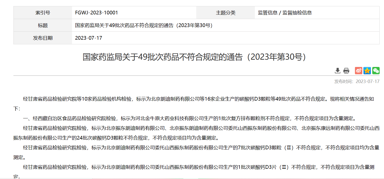 7月17日,国家药监局发布公告称,经甘肃省药品检验研究院等10家药品检验机构检验,标示为北京朗迪制药有限公司等16家企业生产的碳酸钙D3颗粒等49批次药品不符合规定。