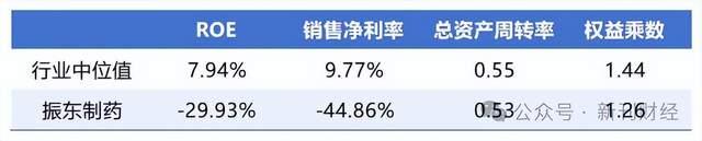 当营收和净利润骤降,振东制药的其他关键财务指标难免全面下滑,基本EPS(每股收益)从-0.04元/股暴跌至-1.30元/股,加权平均ROE(净资产收益率)从-0.84%降至-29.93%,下降29.09个百分点。若用杜邦分析进行拆解,可算得销售净利率为-44.86%,总资产周转率0.55,权益乘数1.26,以上指标全线低于中药行业(申万行业分类二级)的中位值。
