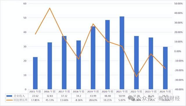 2024年间,振东制药实现营业收入29.71亿元,同比减少18.06%,较之前的2021年峰值50.94亿元缩水超过40%,若进一步回溯,可发现更是回到了2015年至2016年之间的水平,接近倒退十年。