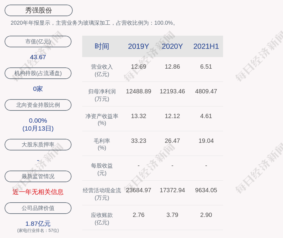 2020年年报显示,秀强股份的主营业务为玻璃深加工,占营收比例为:100.0%。