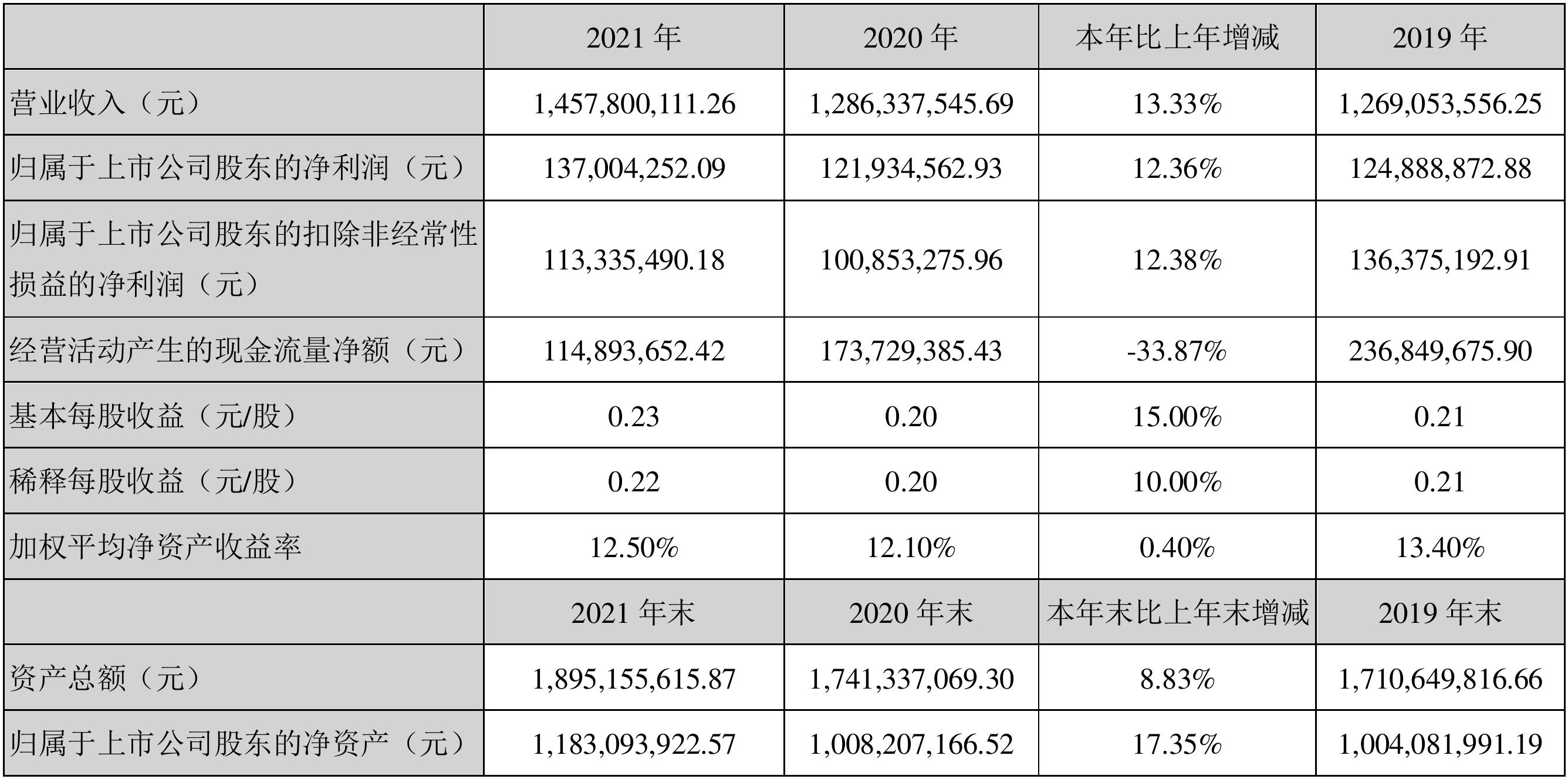 芥末堆文堆九收到A股上市公司秀强股份发布的2021年年度报告,财报显示:报告期内,秀强股份营业收入为14.58亿元,同比增长13.33%,归属于上市公司股东的净利润为1.37亿元,同比增长12.36%。截至报告期末,秀强股份总资产18.95亿元。