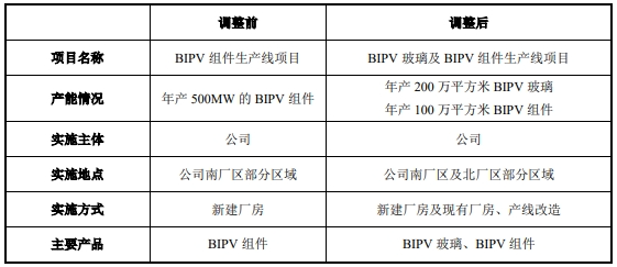 其中,“BIPV玻璃及BIPV组件生产线项目”除项目名称变更外,还对产能情况、实施地点、实施方式等进行了变更,具体如下: