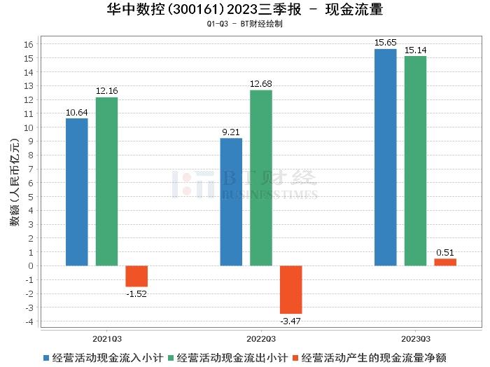 在现金流量方面,华中数控2023年三季度经营活动产生的现金流量净额为5112.07万元,相比上年同期的-3.47亿元有显著提升。经营活动现金流入小计为15.65亿元,相比上年同期的9.21亿元有所增加。经营活动现金流出小计为15.14亿元,相比上年同期的12.68亿元有所增加。