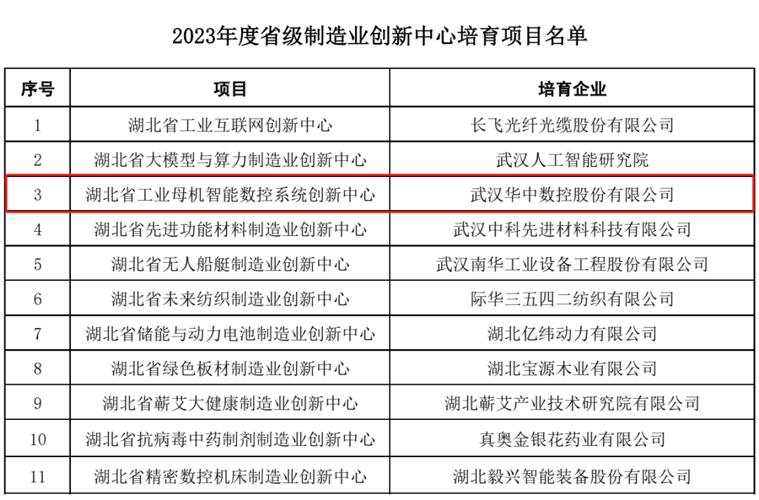 1月5日,湖北省经信厅印发《关于公布2023年度省级制造业创新中心培育项目名单的通知》,将武汉华中数控牵头的“湖北省工业母机智能数控系统创新中心”等11个项目,作为新一批省级制造业创新中心培育对象,培育期为2年。