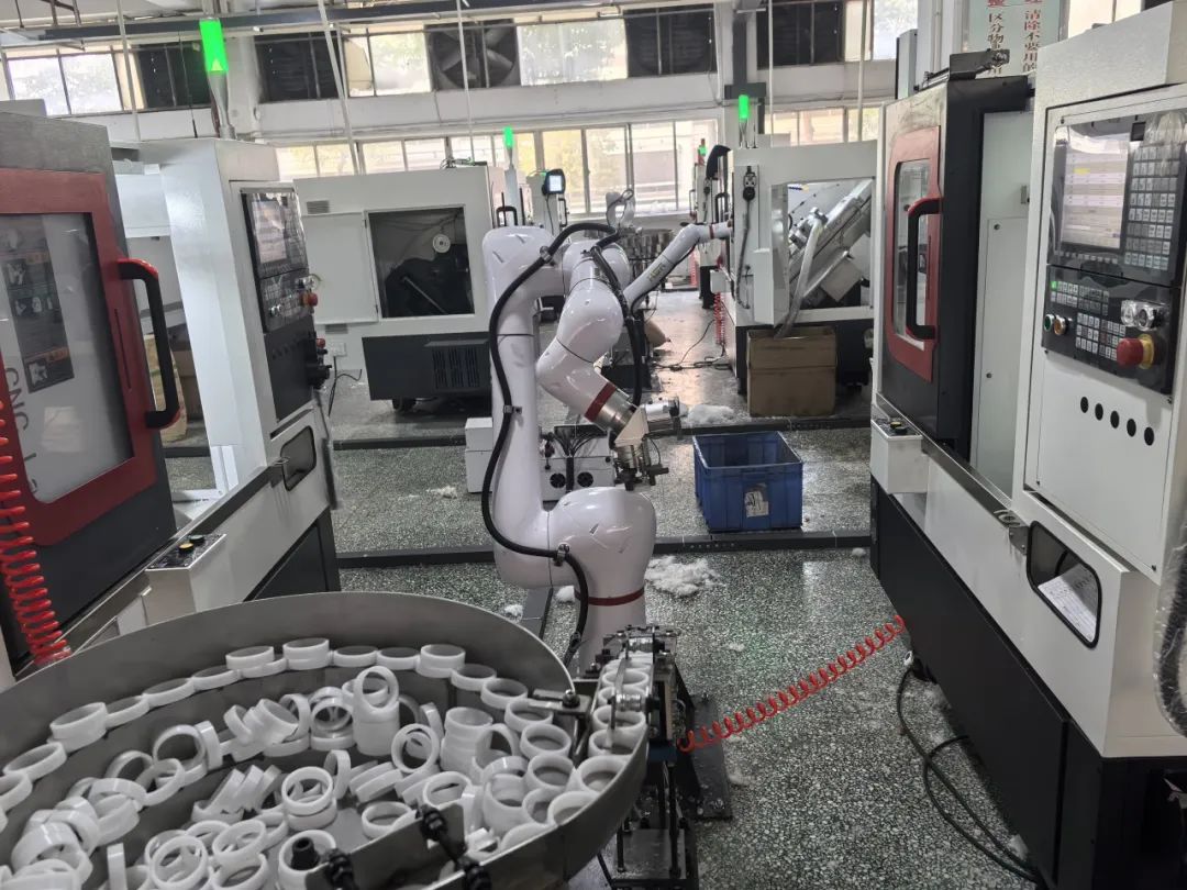 2024年,为了提高轴承产品市场竞争力,铵泽轴承组建起由配套华中数控系统的120余台洪南机械HN-0640斜床身车床和20台华数HSR-CR610协作机器人构成的机加工自动化单元,实现了高速、大批量生产。