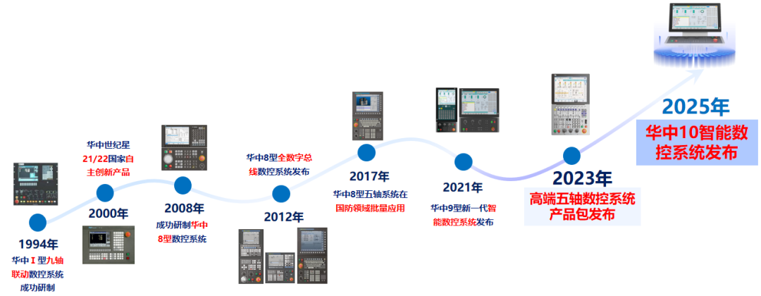 作为国产数控领域的领军者, 华中数控 三十年深耕不辍,技术迭代从未停歇:1994年研制出华中Ⅰ型九轴联动数控系统;2000年华中世纪星21/22系列数控系统获评国家自主创新产品;2008年华中8型数控系统问世,实现国产高档数控系统由模拟、脉冲式向全数字、总线式的跨越;2023年华中8型五轴数控系统产品包正式发布,成为高端模具加工的核心利器。