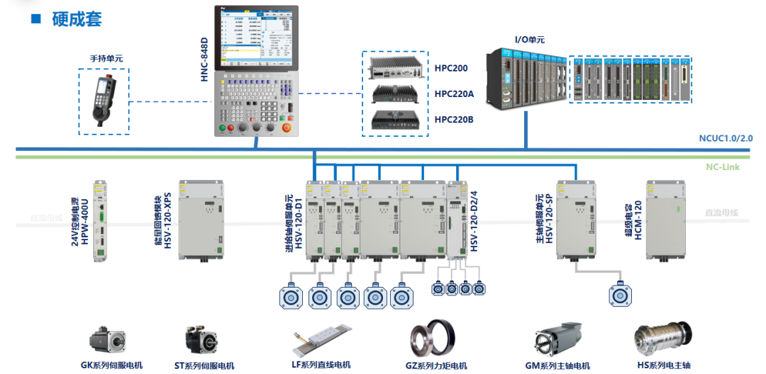 包含主轴伺服单元HSV-120-SP、进给轴伺服单元HSV-120-D1、HSV-120-D2/4等,搭配能量回馈模块HSV-120-XPS,实现绿色节能运行。其中HSV120/HSV130系列伺服驱动单元采用NCUC工业级现场总线,共直流母线模块化结构,支持多编码器协议与双码盘全闭环控制,硬件电流环与制振滤波器保障高精响应,电源模块支持能量回馈,电容模块提供断电回退保护,适配1-250KW伺服电机,覆盖各类加工场景。