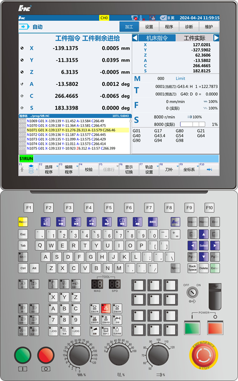 配套的数控系统装置实力出众,不仅支持8个通道/80个轴控制,单个通道可实现9个进给轴/4个主轴的精准调控,完美适配五轴、车铣复合、多轴多通道等各类机型;内置高性能IPC单元,支持500M程序在线编辑,大幅提升加工的灵活性与高效性;配备17寸高分辨率触屏大屏,操作直观便捷,同时支持中英等多种语言交互和面板操控,能够满足不同场景下的多样化使用需求。