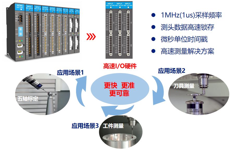 配备高速I/O单元,具备1MHz(1us)超高采样频率,可实现测头数据高速锁存与微秒单位时间戳记录,凭借高性能高速I/O硬件打造出更快、更准、更可靠的高速测量解决方案,不仅能精准满足五轴标定的高精度需求,还可广泛适配刀具测量、工件测量等多样化加工场景,为模具智造等精密生产环节筑牢技术根基。